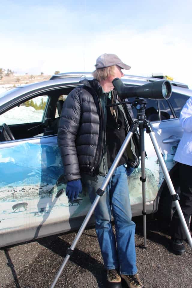I was only able to spy a gray wolf through the wolf whisperer’s scope! I call Rick McIntyre the wolf whisperer since he has been in Yellowstone National Park every day for over 20 years. He is a veteran wolf researcher. Mr. McIntyre has spent this time watching and studying wolves in Yellowstone for the National Park Service.