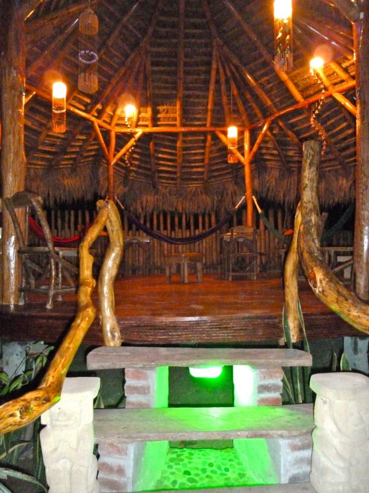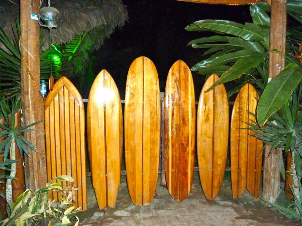 It was as if they knew exactly what we needed: a hip collection of bungalows in the middle of a tropical paradise, along with some of the best eats in the neighborhood. I could not believe our luck! Rasty, the owner, shapes surf boards, as well as shaping the tables and chairs within the compound out of balsa wood. He has added some great custom-built touches made from inlaid rock and glass as well. The property is welcoming – with porches that have hammocks, the pit area, the movie room, the benches throughout the tropical property.