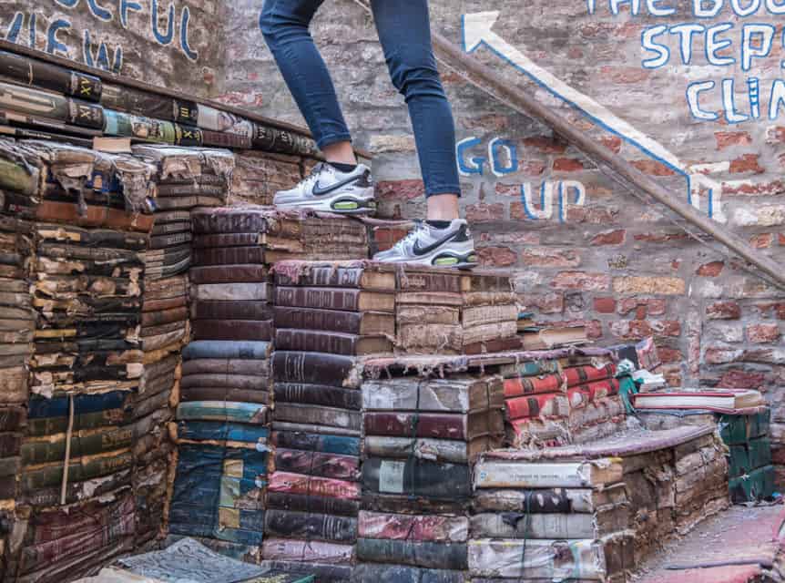 The day wasn’t complete without a stop at the most amazing bookstore, Libreria Acqua Alta, (meaning bookstore of high water) which felt like something out of a Harry Potter book. Thousands of books, stacked from floor to ceiling were stuffed into every nook and cranny in the narrow building adjoining a canal.
