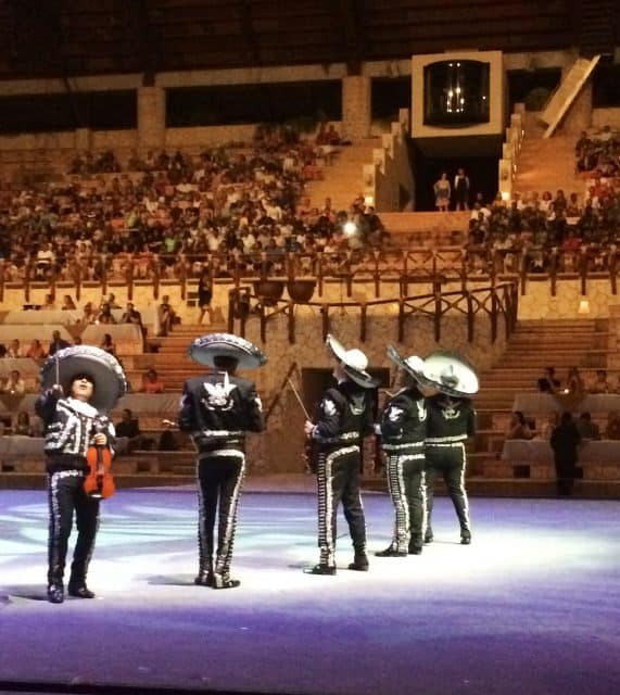 The second half of the show displays the traditions, the music, and the dance of the Mexican people based on regions throughout Mexico. There is great diversity in this country and each region has its own culture within Mexico. This could range anywhere from mariachis (single males, group of males to groups of all female mariachis) to lasso roping, to Chicano style music and followed by performances by beautiful dancing ladies with traditional clothing from different regions. As a perfect ending, Macaw birds soar across the theater’s thatched roof, while the cast waves and sings goodbye.