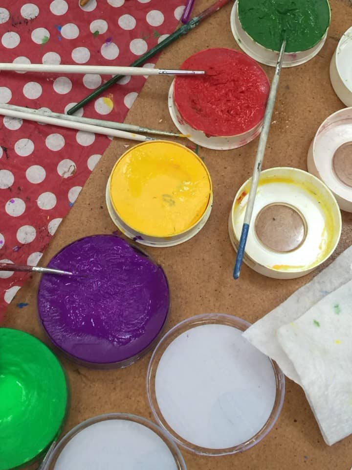 Stacked up in bins along the walls were rainbow-colored bins. I was told they come in different sizes and shapes for a reason! Each one was lying across a cup of bright, rainbow-colored makeup tubs or scattered on the tables. Baby wipes and Kleenex were in amply amounts also strewn across the tables. These were here to help stop the sweat after makeup was applied or to wipe down the face first.