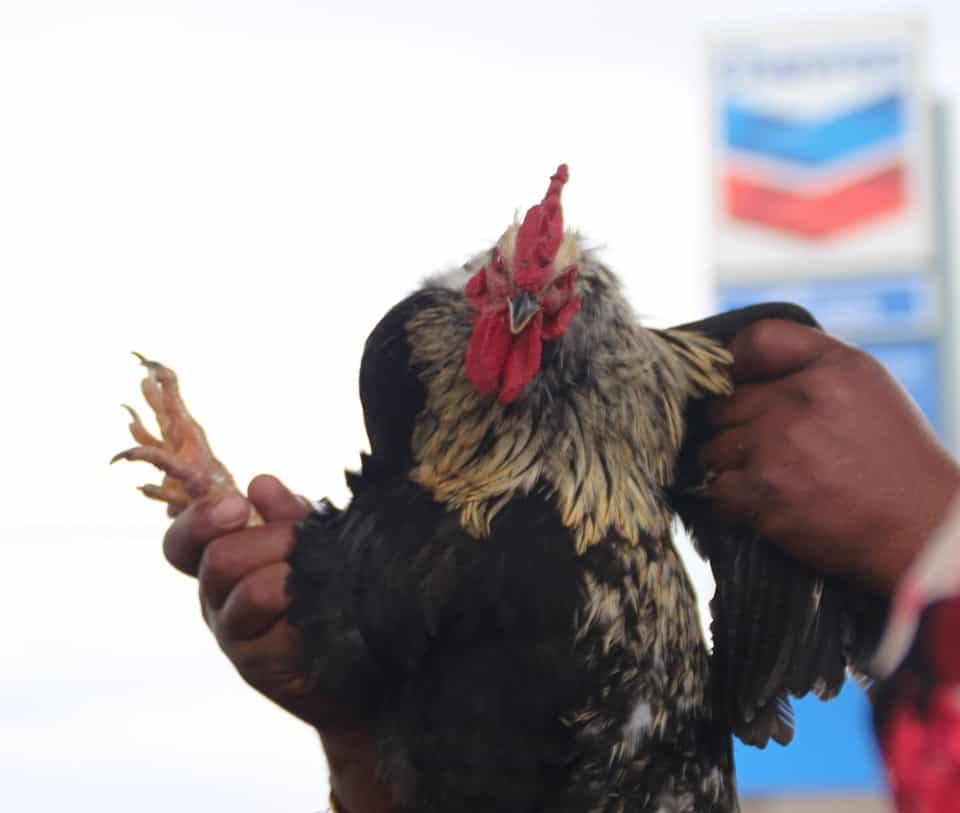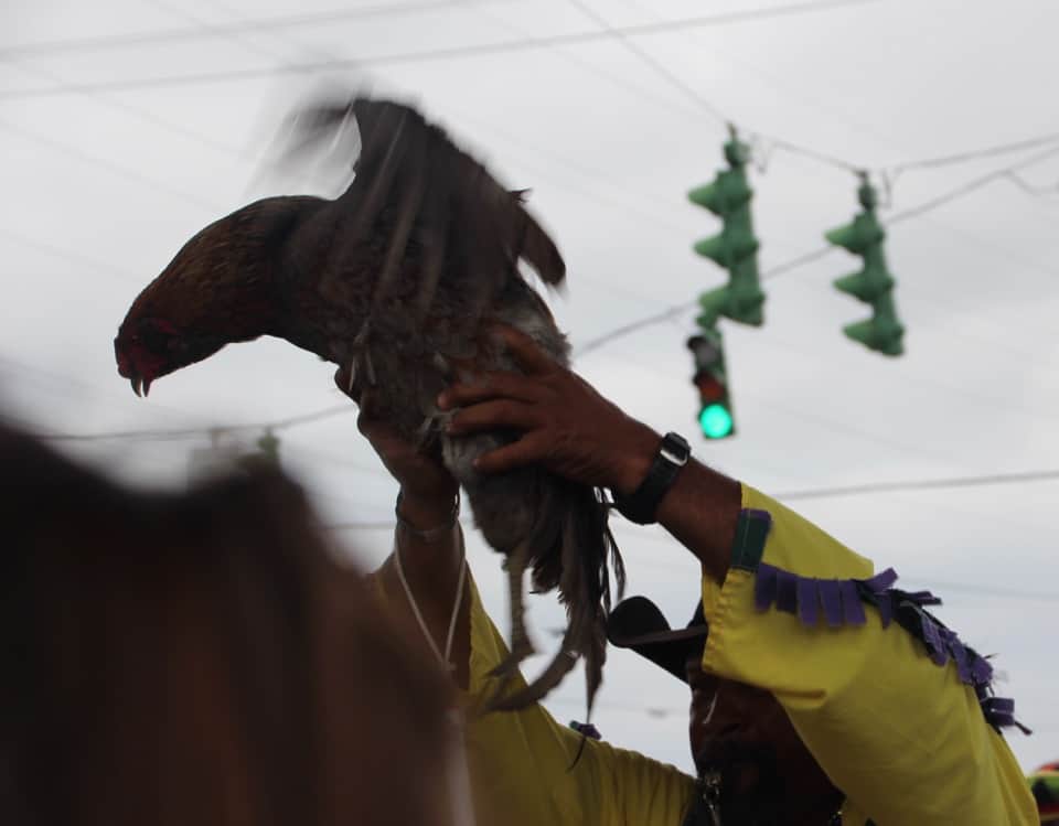 In the meantime, some owners used to offer up a chicken, so today, they bring the chickens in cages and one guy then grabs a chicken, hangs it upside down in a crowd, and then lets it loose!