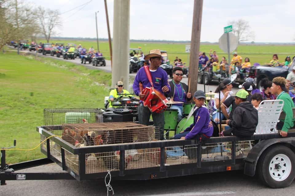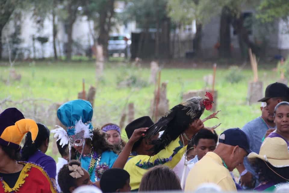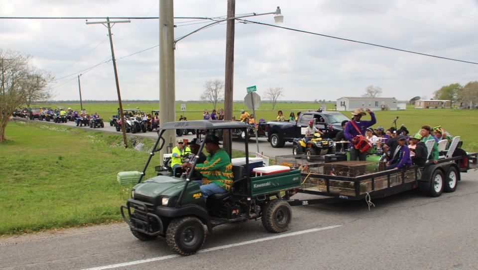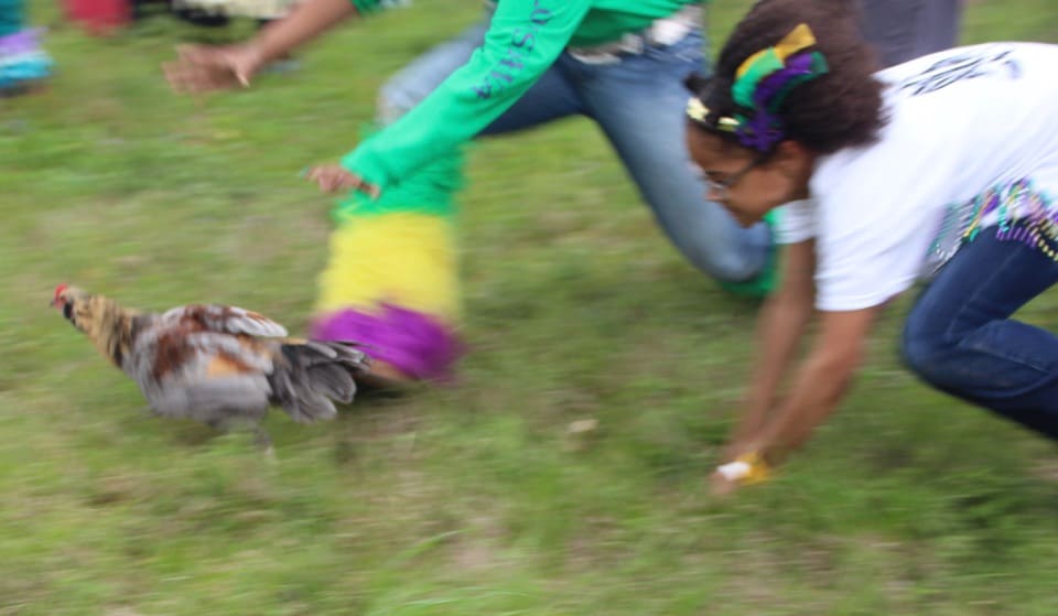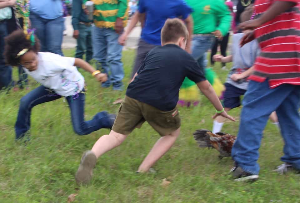 Let me explain: Basically, the Chicken Run is a ceremonial re-enactment of the past when people used to go house to house and gather ingredients to make a large vat of gumbo.