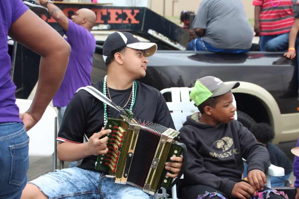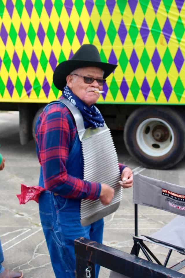 Zydeco music was playing by a live band in the back of a parade-like float being pulled by a tractor trailer. I saw him out of the corner of my eye, an old man with a shiny washboard on his chest, a cigarette hanging out of his mouth, and strumming his fingers to the music alongside a young man playing the accordion.