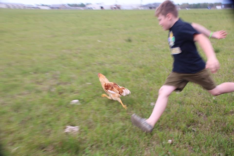 The kids go wild and start to chase the chicken until someone catches it.