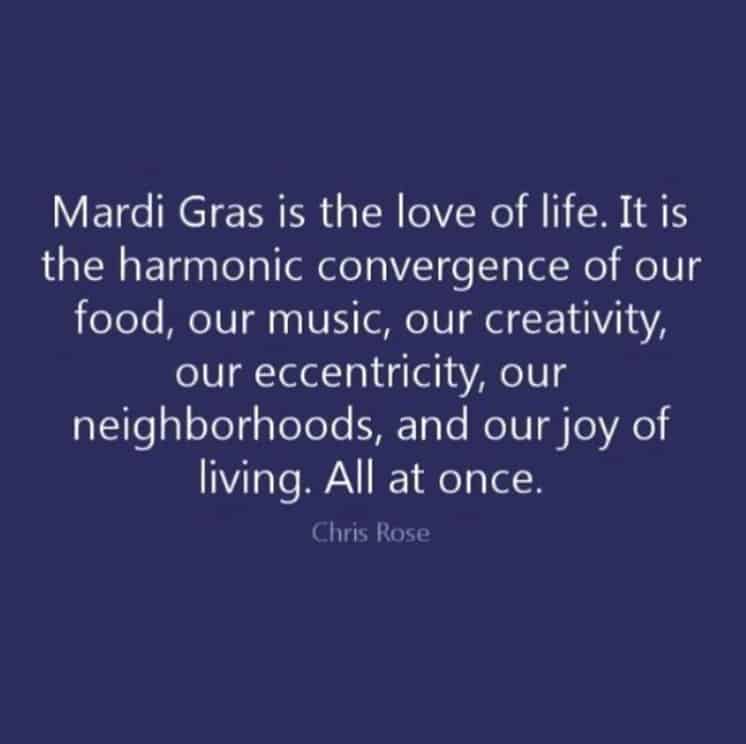 Mardi Gras is the love of life. It is the harmonic convergence of our food, our music, our creativity, our eccentricity, our neighborhoods, and our joy of living. All at once. – Chris Rose