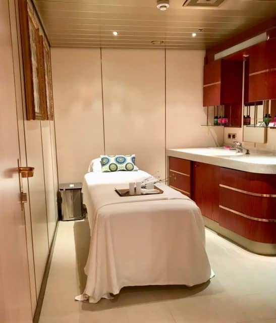 The interior, ocean-view, and verandah rooms include 2 twin beds that can convert to a queen-size bed. The mattress is by Sealy, which as a Chiropractor in my previous life, I appreciate. The massage showerheads in the private bathrooms offer optimal water pressure. Almost better than I get at home! These rooms also include the following: hairdryers, mirrors, shampoo, lotions, soap, ice bucket, a turndown service, Flat-panel TV, and a DVD player. The ocean-view rooms are slightly larger. They have a view of the stunning ocean to greet guests during their stay.