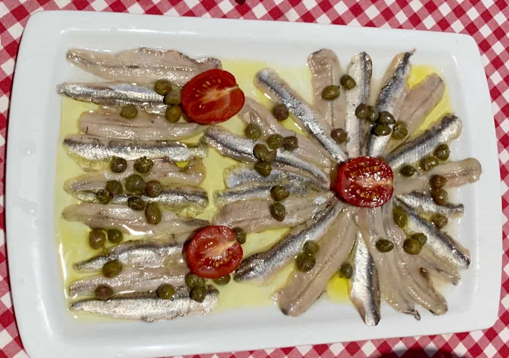 Before I knew it, the food begins to arrive on the table. Marija explains each dish as she places it before us. She brings out an extraordinary spread of Dalmatian delights: a gorgeous fresh salad and bowls of recently-picked olives. Overflowing plates of thinly sliced Dalmatian prsut (cured pork prosciutto) with pancetta, sausages, and Croatian cheeses. Next comes the anchovies soaked in olive oil with slices of tomatoes and capers.