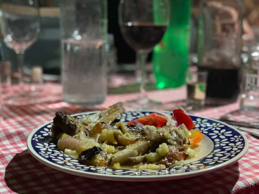 Dubrovnik city center, Dubrovnik food, Croatian food, Croatian cuisine, Croatian desserts #CroatianFood #CroatianDesserts #DubrovnikFoodAfter I think that I can eat and drink no more, the long-anticipated roasting pan that Zlatko has been cooking for hours gets placed on the center of the table. As he lifts the lid, I can hear the sizzling sounds of the juices, followed by the smell of roasted lamb. Mariia had prepared this dish earlier in the day with rosemary, garlic, and onions from her recent trip to the local outdoor market, as well as with sea salt and slices of fresh potatoes in olive oil.