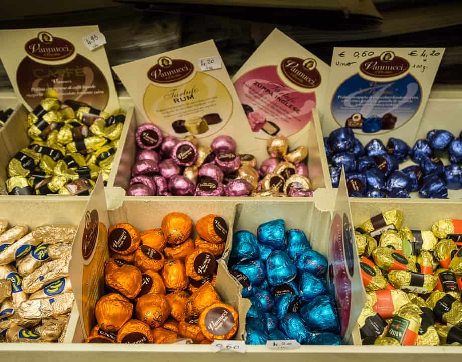 With our next stop at Osteria A Priori, we would get to taste Fagiolina del Trasimeno, a small multi-colored legume, served with Grechetto wine. This legume faced near extinction in favor of other more profitable crops but is making a comeback thanks to local farmers in Umbria. We then made our way to Perugia’s oldest spice shop and general store, Antica Spezieria Drogheria Bavicchi. Here we were able to pick and choose a handful of Perugia chocolates to sample.