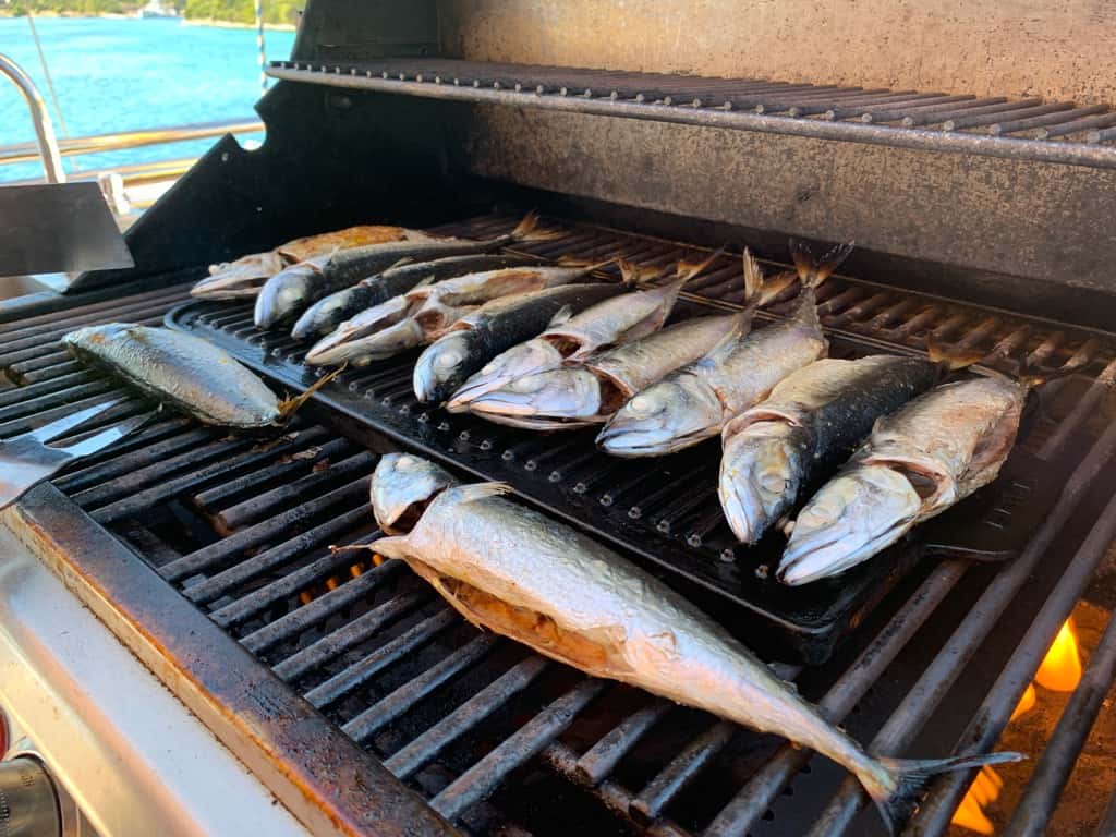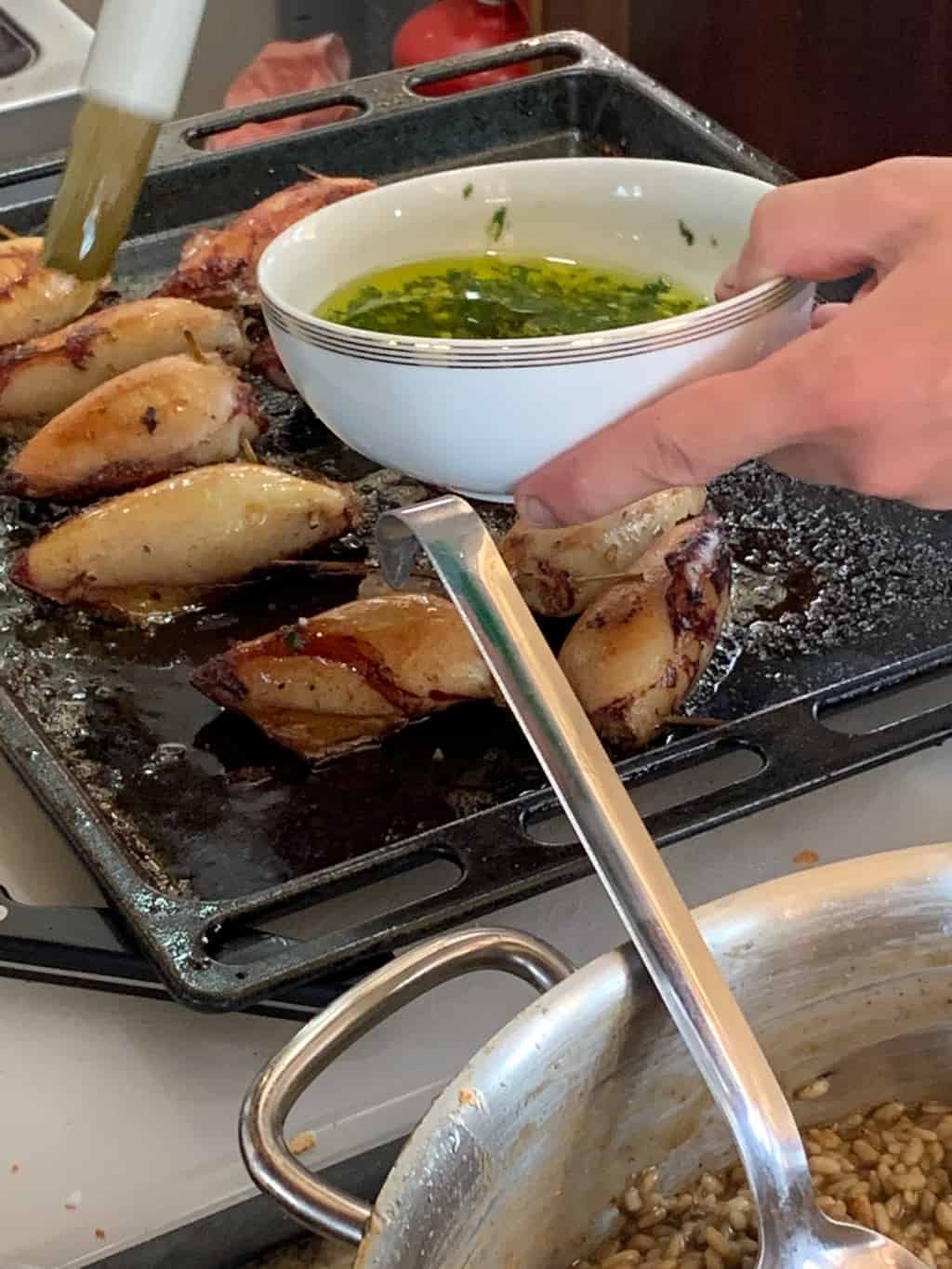 One of the best meals I ate was the night that the waiter caught a huge stash of squid that was stuffed with risotto rice in Korcula! That day, the captain also caught a lot of smaller Mackerel fish. He grilled the fish and the squid by brushing them with marinated olive oil using the same marinade that the chef made for the stuffed squid.