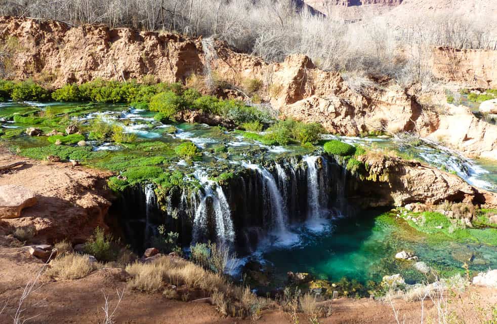 You have made it to camp and you are backtracking towards the falls. The Havasu Falls themselves consist of one main 95-to-100 foot drop into a grouping of plunge pools below. The high mineral content of calcium carbonate in the water creates its world-famous blue-green color as well as forms natural dams near the base of the falls. Here you can go swimming where the water is 4-to-5 feet deep in most places.