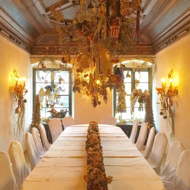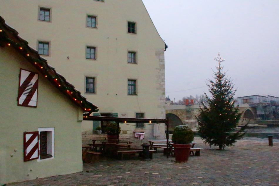 I invited my travel friend for lunch in a restaurant that was originally built as the headquarters for the construction of the bridge in 1146, where it is now a restaurant! They also have an outdoor takeaway counter if you prefer. But it was cold outside and we wanted to get warm in the restaurant that was elegantly decorated for Christmas with warm candle lights! Of course, we ordered their famous sausages and sauerkraut and tried their world-famous honey mustard!