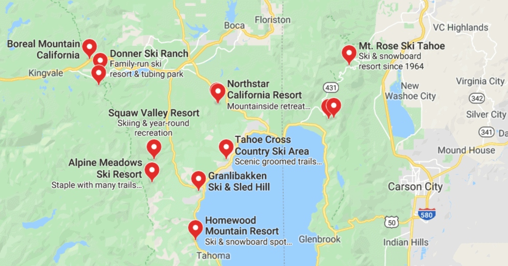 As you can see from this map, there are 12 ski resorts are within the range of North Lake Tahoe. (There are 4 that are in the range of South Lake Tahoe, which I won’t mention here.)
