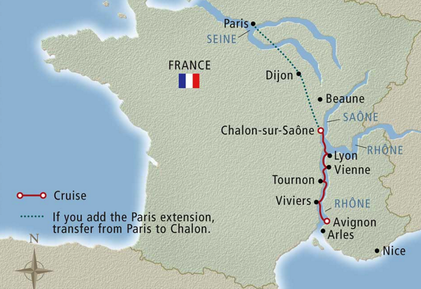 Making my way from Paris via the TGV fast train to Marseille in South France for an overnight before boarding the Viking River Cruise, I couldn’t get there quick enough. I had heard of the geographical and historical region Provence in Southern France for years and dreamed of taking a trip to see what all the fuss was about. From the map below, you can see that my itinerary was from Avignon to Lyon gliding down the Seine River.