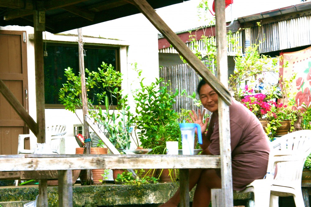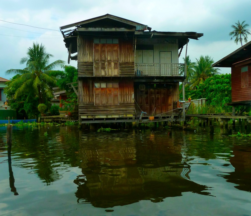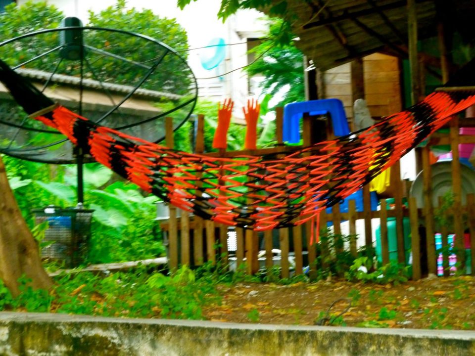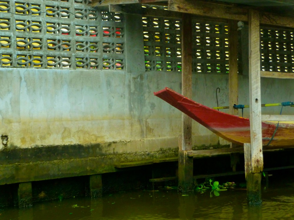I would have liked to better understand these river people and their homes and culture that I saw on the river that day… a naked, squatting man, large lizards, laundry washers, workers, fire pits, colorful laundry hanging in the wind, trash, a satellite dish, orange latex gloves on stilts and lounging hammocks beside blue stepstools. Everything here in Bangkok on the river is so random.