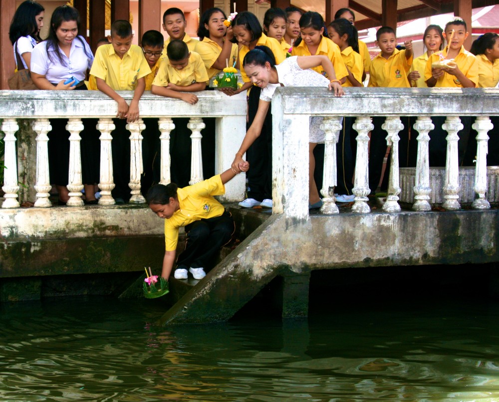 Soon we come across a schoolyard of children who are putting celebration lanterns into the water.