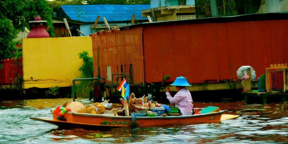 Riding boats that are powered by a noisy motor, we sputter past monasteries, temples, and ramshackled huts on stilts over pea-green then coffee-colored waterways, where there are Asian-hatted fisherman along the shores. With each glide of the decorated, colorful boats (called “klongs”), we go deeper into its grips. The waterways get narrower and narrower as we make our way pass rickety housing and orange-robed monks.