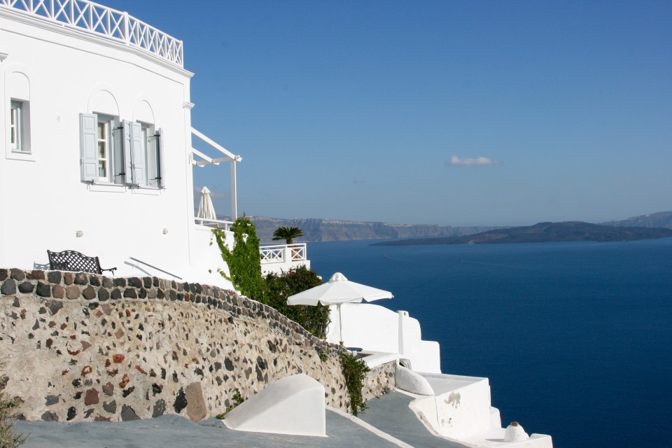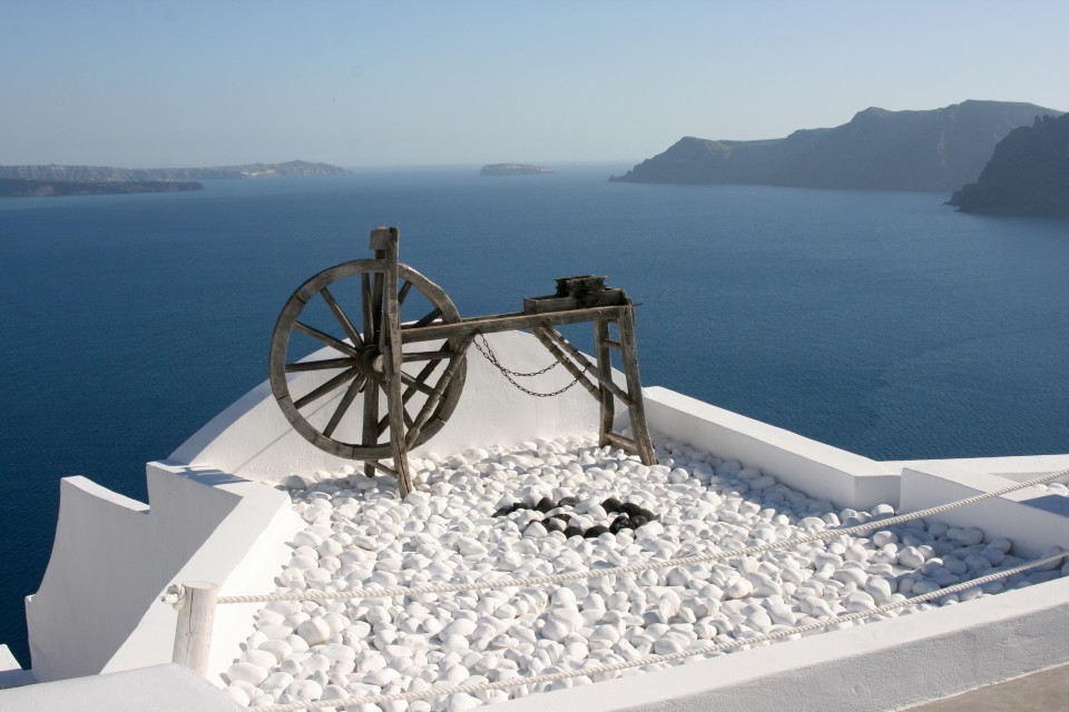 In the distance, you can literally see hundreds of them, those famous Greek blue domed churches, whitewashed buildings and infamous windmills flapping in the wind.