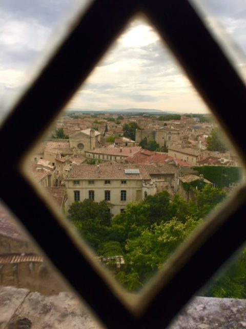 Peaking thru the window inside the Palais des Papes to the city of Avignon, France