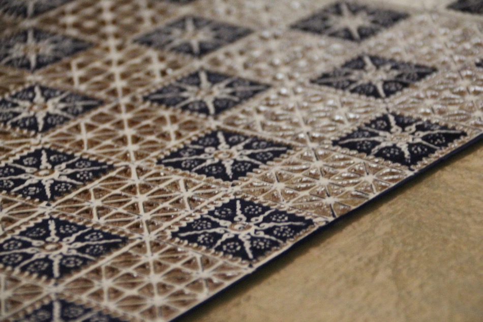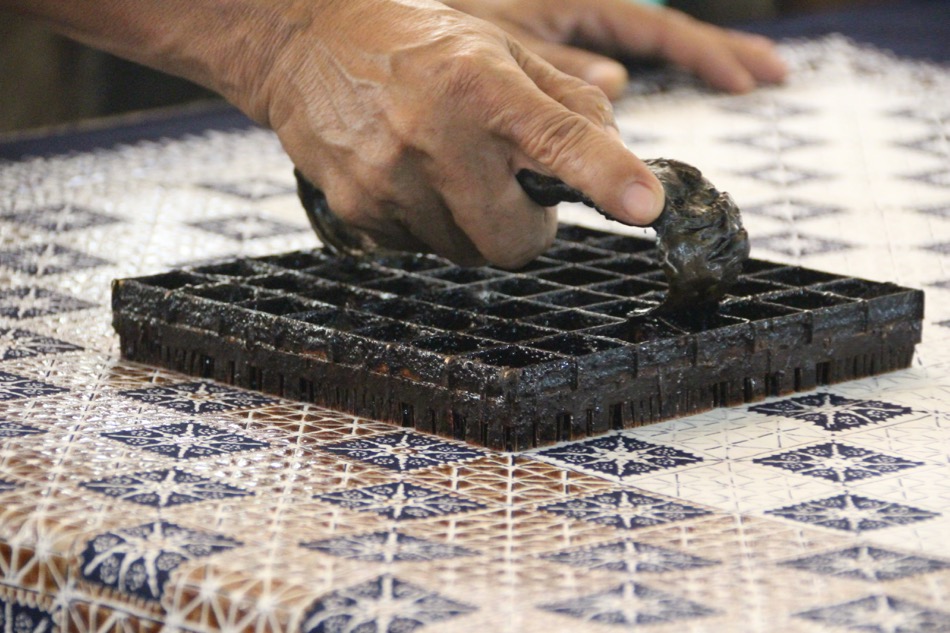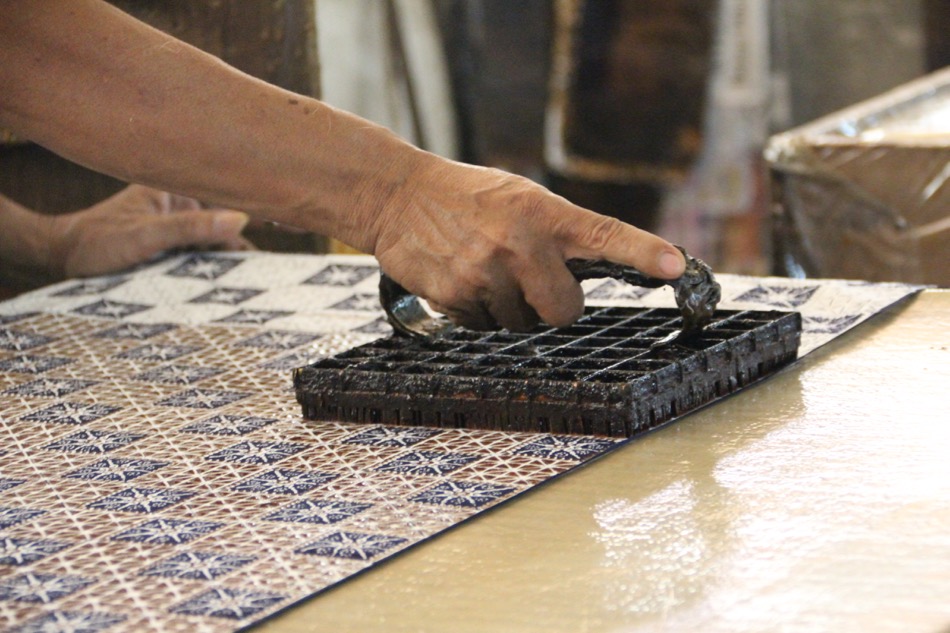 Each of them slowly placing the large stamp in just the right place to make the pattern perfect on a piece of cloth.