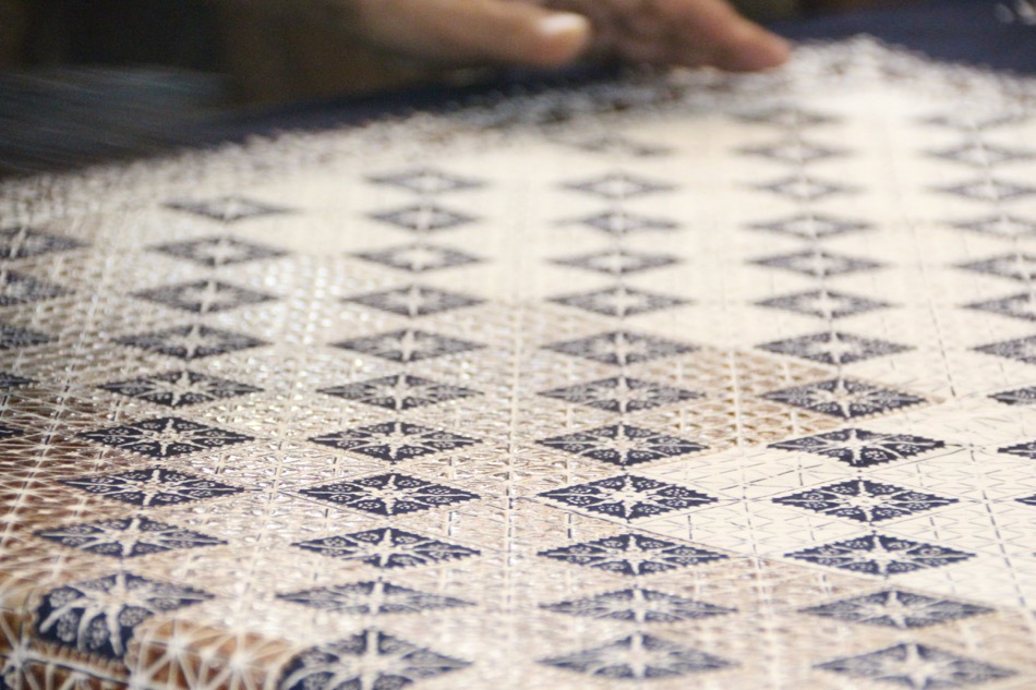 They create an outline of elaborate designs. I stand there in amazement as I look to see what incredible designs these women have created by hand. I walk between the women groups on the floor and admire their work. The manual process is slow and steady and takes hours and hours to complete one piece.