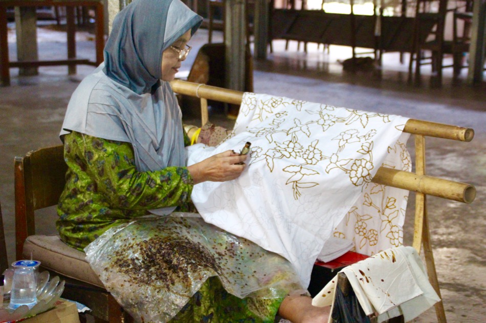 Batik is an art process where a metal shaped bell tool, a tjanting, is dipped and then filled with wax. They blow on the tip to slightly cool it and then slowly hold the tip like a pencil to attach the wax to the fabric.